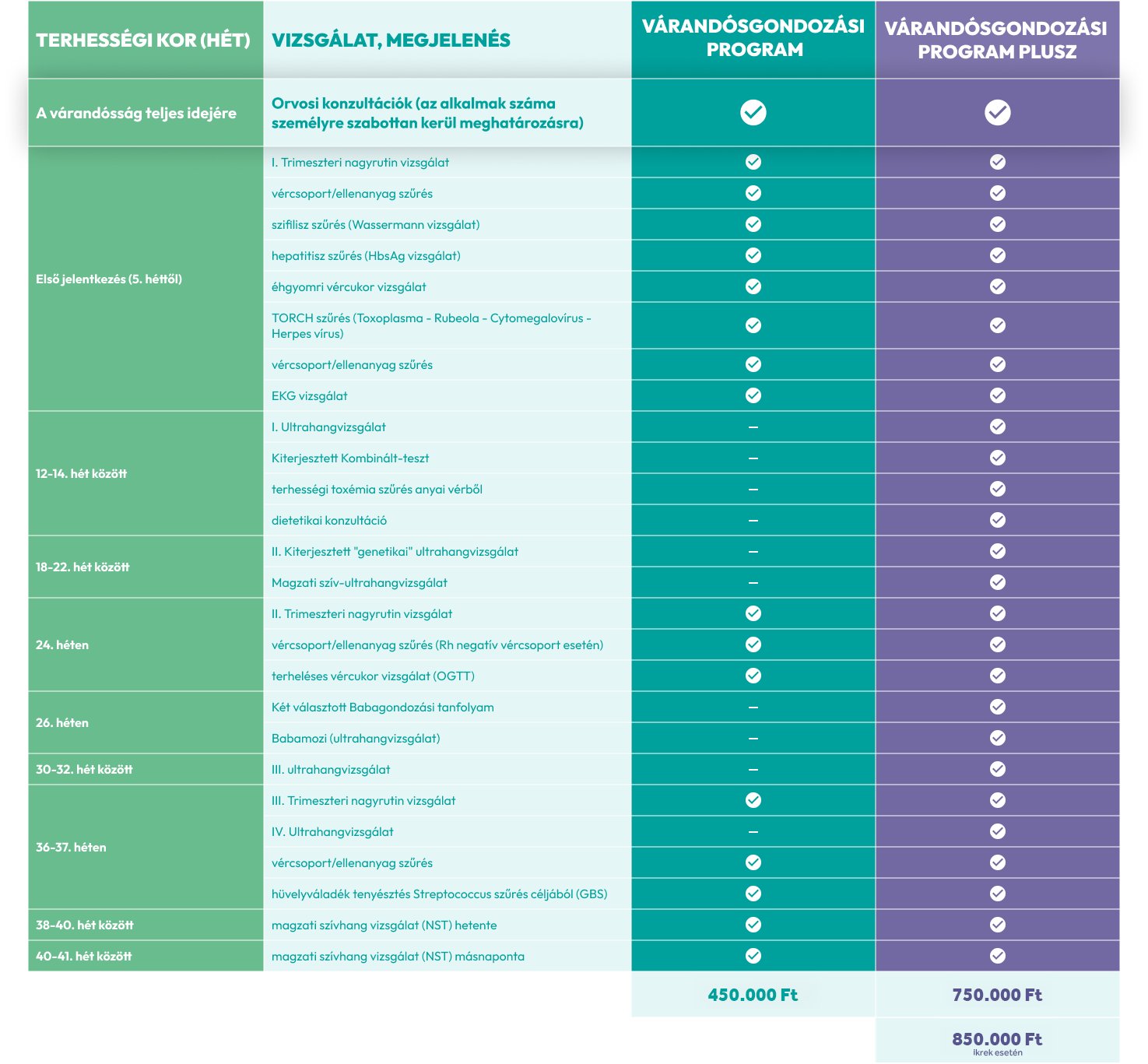 Kínálatunkban két gondosan összeállított csomag érhető el: a Várandósgondozási Program, amely minden alapvető vizsgálatot tartalmaz, valamint a Várandósgondozási Program Plusz, amely kiegészítettünk a magzati diagnosztikai vizsgálatokkal és extra szolgáltatásokkal, mint például Babagondozási tanfolyamaink, ezért nyújt még nagyobb biztonságot és kényelmet a kismamáknak.